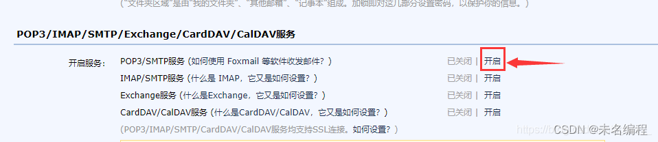 第三步在这个页面找到下图这个位置,在POP/SMTP服务哪一行,点击开启,这个时候你会看到一个弹框,按照里边的要求,发一封短信,此时你会看见一串字符,这个就是你的授权码。