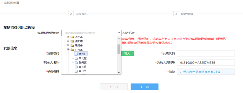 ①根据需要下拉框选择-车辆拟登记(上户)地点-自动带出税务机关(无需修改税务机关)